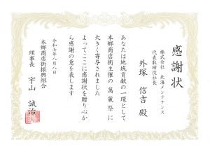 白石区本通地区 配水管整備工事(感謝状) | 株式会社 北海メンテナンス
